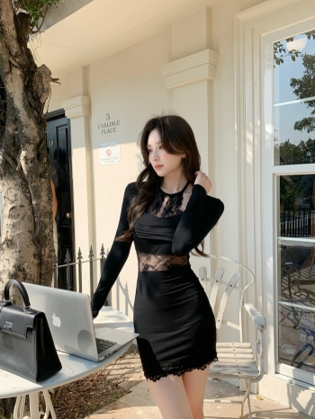 【Z828357】純欲風蕾絲拼接掛脖針織洋裝