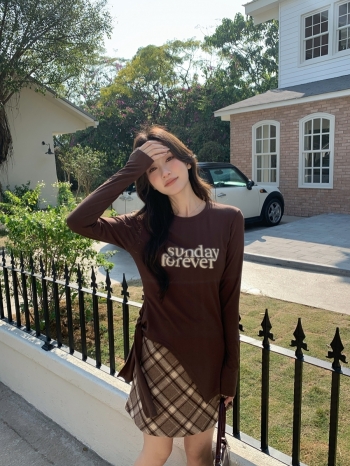 【Z828383】字母褶皺磨毛上衣+奶咖格紋短裙