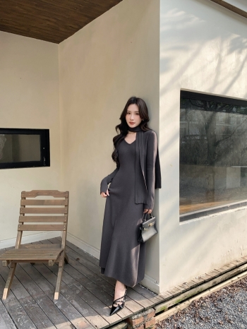 【Z828418】溫柔風配圍巾V領收腰A字針織洋裝