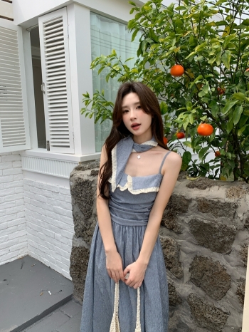 【Z828582】甜美田園風肌理紋壓褶蕾絲邊洋裝
