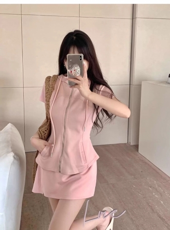 【Z828753】連帽收腰設計外套+側開衩短裙休閒套裝