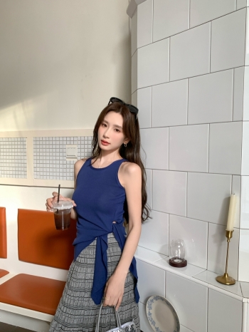 【Z828955】不規則收腰綁帶背心+條紋摺皺長裙