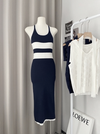 【Z829172】撞色條紋露背U領掛脖針織裙