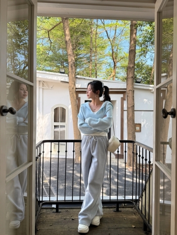 L 上外肩寬44 胸寬42 衣長44 袖長53 上內胸寬39 衣長43 下腰圍29-39 臀圍49 大腿圍31 褲長100