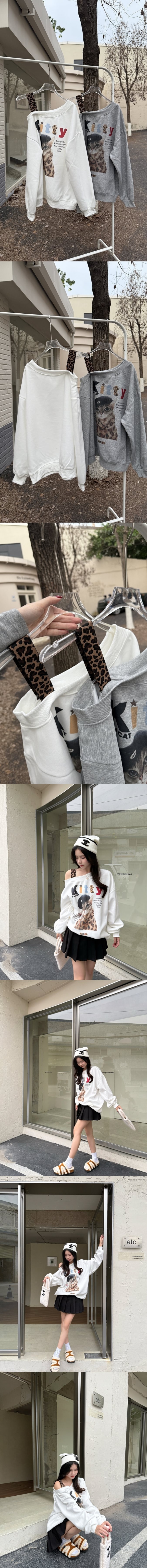 【Z829876】可愛豹紋貓咪印花露肩上衣