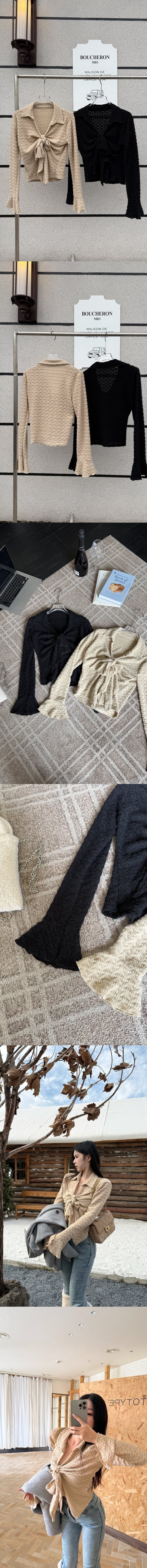 【Z830092】V領摺皺扭結綁帶喇叭袖針織衫