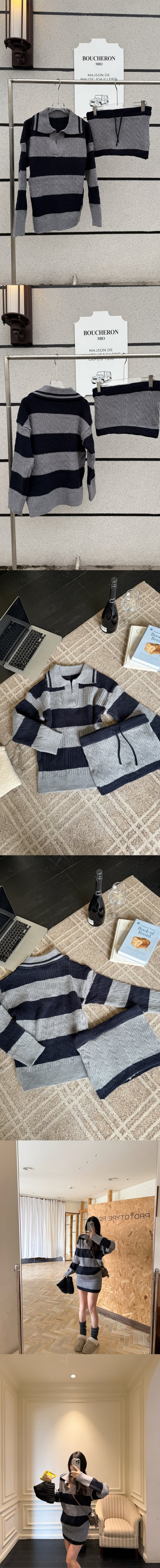 【Z830077】韓系chic翻領條紋毛衣針織裙套裝