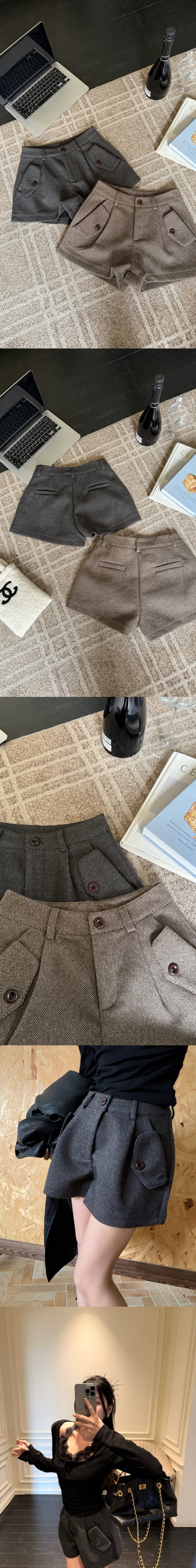 【Z830080】格紋壓摺口袋設計毛呢短褲