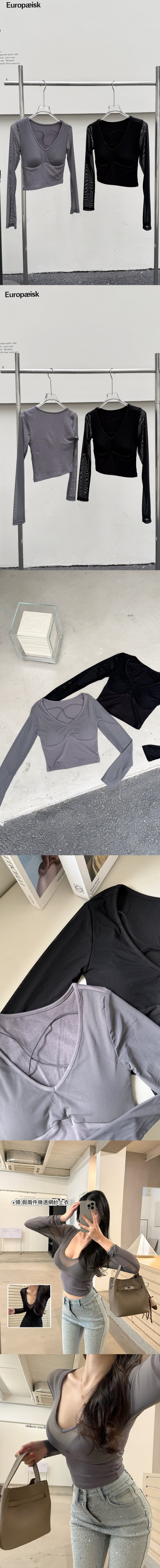 【Z830269】網紗拼接假兩件交叉V領長T