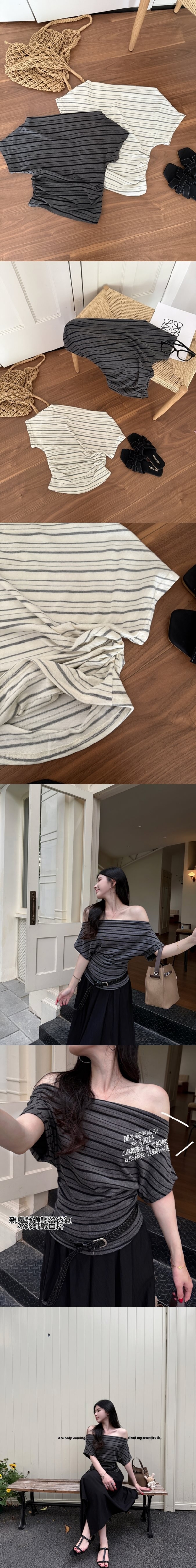 【Z830439】設計感蕩領條紋收腰短袖上衣