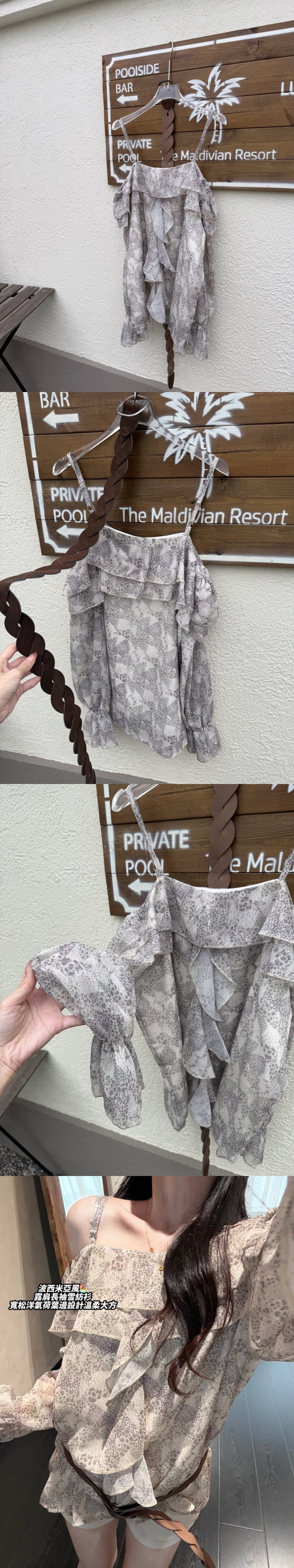 【Z830540】一字肩荷葉邊豹紋喇叭袖襯衫(附腰帶)